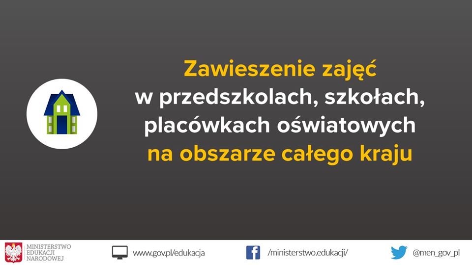 1. Od jutra tj. 12 marca (czwartek) do 25 marca (środa) br. funkcjonowanie jednostek systemu oświaty zostaje czasowo ograniczone. Oznacza to, że w tym okresie przedszkola, szkoły i placówki oświatowe zarówno publiczne, jak i niepubliczne NIE BĘDĄ PROWADZIŁY zajęć dydaktyczno-wychowawczych. To decyzja Ministra Edukacji Narodowej i premiera RP Mateusza Morawieckiego wynikająca z konieczności zapobiegania rozprzestrzenianiu się koronawirusa.