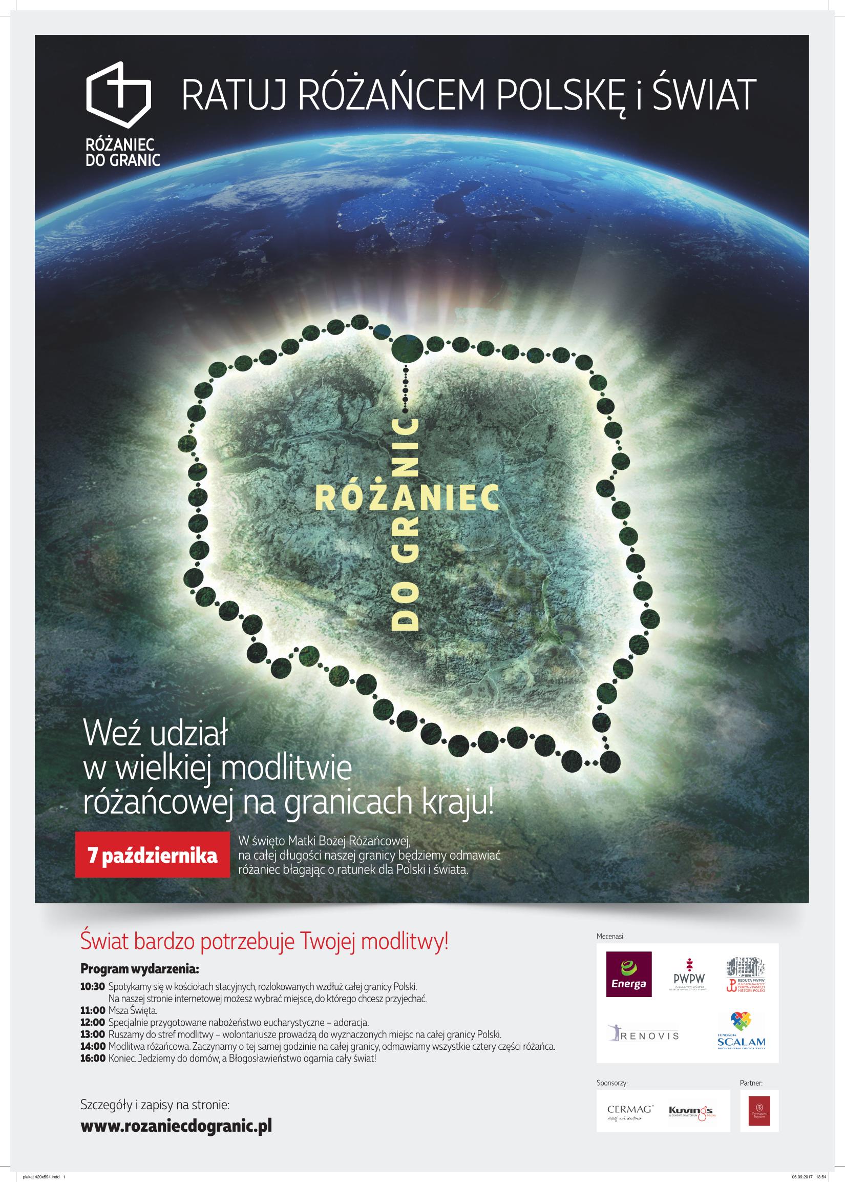7 października 2017 r. w całej Polsce odbędzie się wielka modlitwa różańcowa. Hasłem stały się słowa ?Różaniec do granic?. Trzeba je czytać dwojako: dosłownie ? setki tysięcy ludzi zgromadzą się w różnych miejscach przy granicach Polski, aby prosić Pana Boga przez przyczynę Matki Najświętszej o pokój na świecie, i przenośnie ? jako wędrówkę ?do granic naszych możliwości, naszych lęków, naszych pragnień. Poza granicę komfortu, codzienności i naszych przyzwyczajeń? - po to, aby oddać je Jezusowi Chrystusowi.